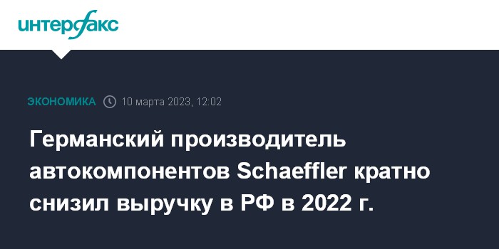 Москва. 10 марта. INTERFAX.RU - Российские торговое и производственное предприятия германского производителя автокомпонентов Schaeffler в 2022 году резко снизили выручку, завод компании в Ульяновске закончил год с убытком.