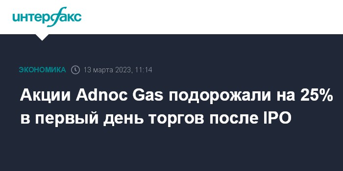 Москва. 13 марта. INTERFAX.RU - Цена бумаг Adnoc Gas, газового подразделения энергетической госкомпании ОАЭ Abu Dhabi National Oil Co. (ADNOC), подскочила на 25% в начале первого дня торгов после IPO, крупнейшего в 2023 году, пишет Bloomberg.
