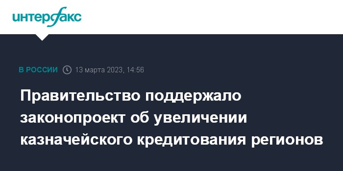 Москва. 13 марта. INTERFAX.RU - Правительство вынесло положительное заключение на депутатский законопроект, который увеличивает с 250 до 300 млрд рублей объем казначейских кредитов, которые могут быть предоставлены регионам в 2023 году.