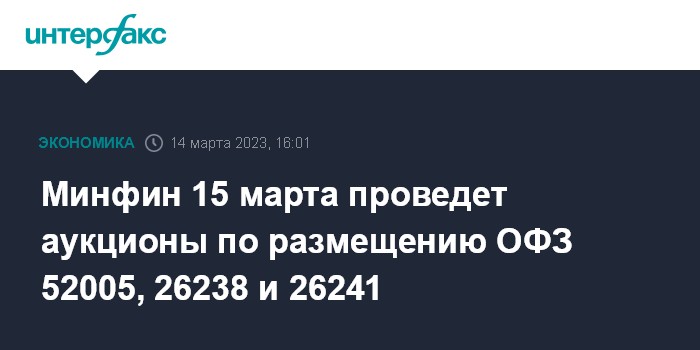 Минфин 15 марта проведет аукционы по размещению ОФЗ 52005, 26238 и 26241