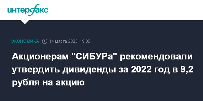 Москва. 14 марта. INTERFAX.RU - Совет директоров "СИБУРа" рекомендовал выплатить дивиденды за 2022 год в размере 9,2 рубля на акцию. Эта информация раскрыта на портале НРД.