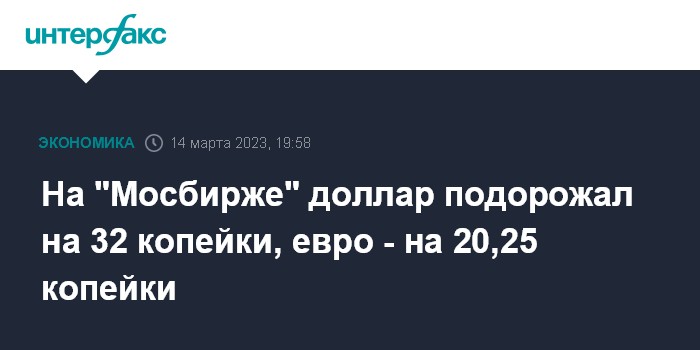 Москва. 14 марта. INTERFAX.RU - На торгах на "Московской бирже" во вторник курсы доллара и евро укрепились после снижения днем ранее.
