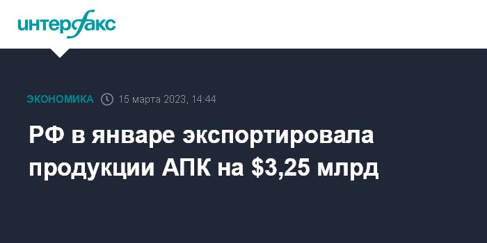 Москва. 15 марта. INTERFAX.RU - РФ в январе этого года экспортировала продовольствия и сельхозсырья на $3,25 млрд, сообщается в материалах ФТС.