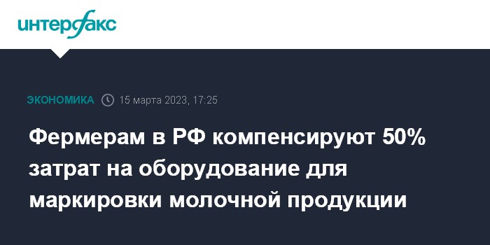 Москва. 15 марта. INTERFAX.RU - Фермеры и сельхозкооперативы РФ получат компенсацию 50% средств, затраченных на покупку оборудования для маркировки молочной продукции. Их продукция подпадает под маркировку с 1 декабря 2023 года, сообщается в пресс-релизе Центра развития перспективных технологий (ЦРПТ, оператор госсистемы маркировки "Честный знак"), который будет софинансировать эти затраты.