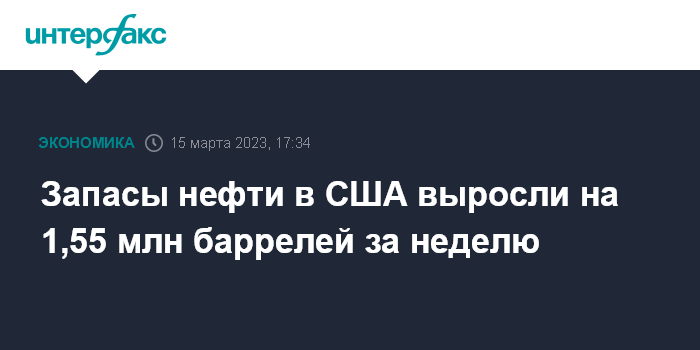 Москва. 15 марта. INTERFAX.RU - Коммерческие запасы нефти в США на прошлой неделе увеличились на 1,55 млн баррелей - до 480,06 млн баррелей, свидетельствуют данные еженедельного доклада министерства энергетики страны.