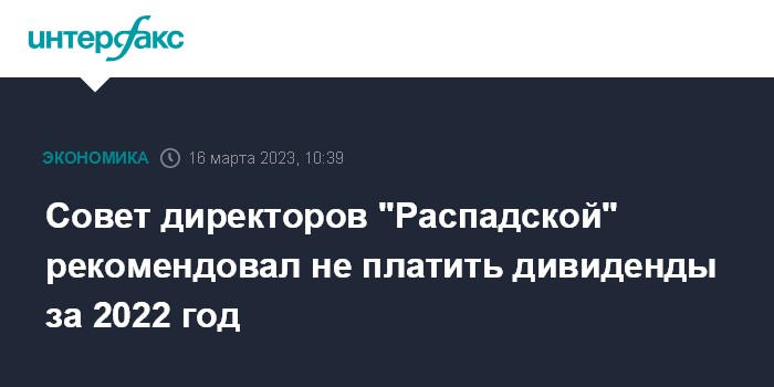 Москва. 16 марта. INTERFAX.RU - Совет директоров "Распадской" решил не рекомендовать годовому собранию акционеров выплату дивидендов по результатам 2022 года, сообщила компания.