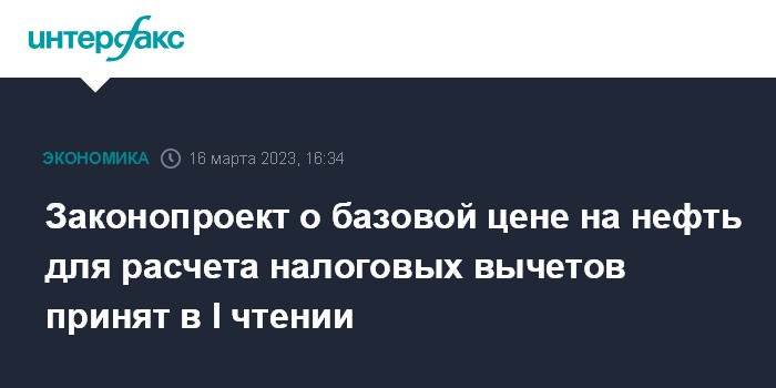 Москва. 16 марта. INTERFAX.RU - Депутаты Госдумы приняли в I чтении законопроект, который прописывает уровень базовой цены на нефть для применения налоговых вычетов в нефтяной отрасли. Законопроект № 310880-8 в начале марта внесло в парламент правительство.