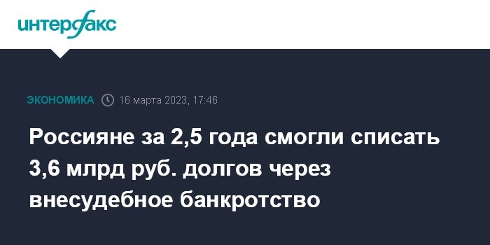 Москва. 16 марта. INTERFAX.RU - Долги на сумму в 3,59 млрд рублей были списаны с 10,3 тыс. граждан-банкротов в рамках внесудебной процедуры банкротства за время ее существования с сентября 2020 года по конец февраля 2023 год, сообщил руководитель "Федресурса" Алексей Юхнин (Единый федеральный реестр сведений о банкротстве, fedresurs.ru) в ходе пресс-конференции в "Интерфаксе".
