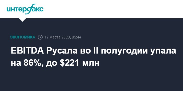 Москва. 17 марта. INTERFAX.RU - Скорректированная EBITDA "Русала" во втором полугодии 2022 года упала на 86%, составив $221 млн, сообщила компания в пятницу.