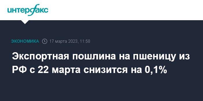 Экспортная пошлина на пшеницу из РФ с 22 марта снизится на 0,1%