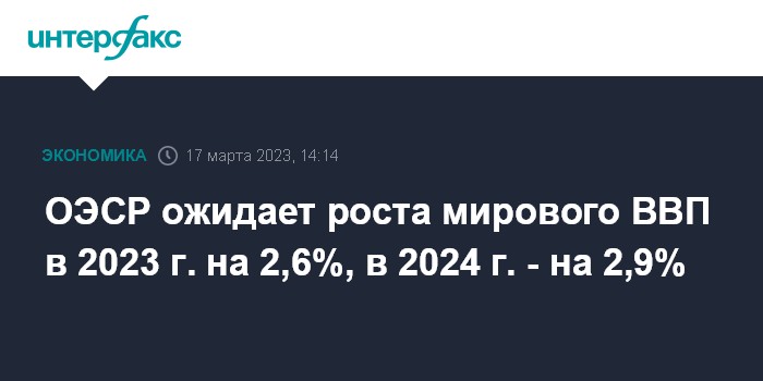 Москва. 17 марта. INTERFAX.RU - Организация экономического сотрудничества и развития (ОЭСР) повысила прогноз роста глобальной экономики на 2023 года до 2,6% с ожидавшихся в ноябре 2,2%.