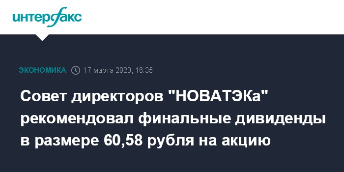 Совет директоров "НОВАТЭКа" рекомендовал финальные дивиденды в размере 60,58 рубля на акцию