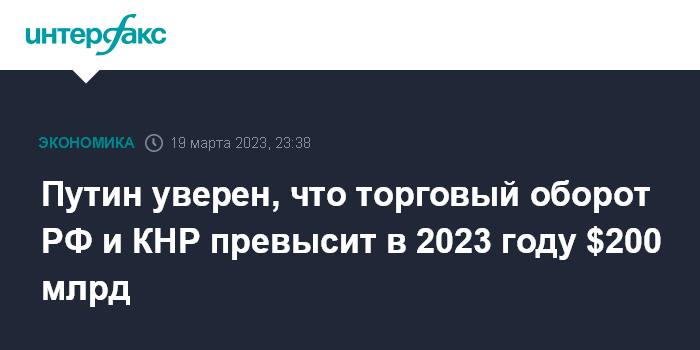 Путин уверен, что торговый оборот РФ и КНР превысит в 2023 году $200 млрд