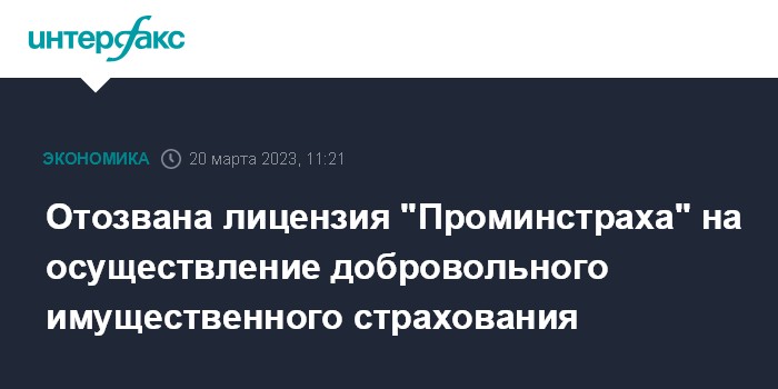 Москва. 20 марта. INTERFAX.RU - Банк России отозвал у страховой компании ООО "Проминстрах" лицензию на осуществление добровольного имущественного страхования в связи с отказом общества от осуществления предусмотренной лицензией деятельности, говорится в сообщении ЦБ.