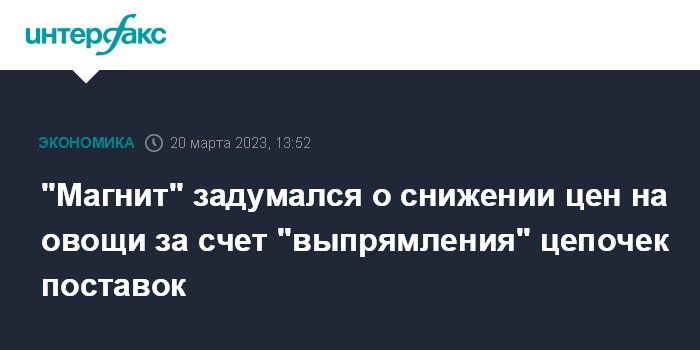 Москва. 20 марта. INTERFAX.RU - "Магнит", ведущий ритейлер РФ по количеству магазинов, намерен "выпрямлять" цепочки поставок овощей в свою торговую сеть. Именно в неэффективности этой системы компания видит основную причину большой разницы в отпускных и розничных ценах на них.