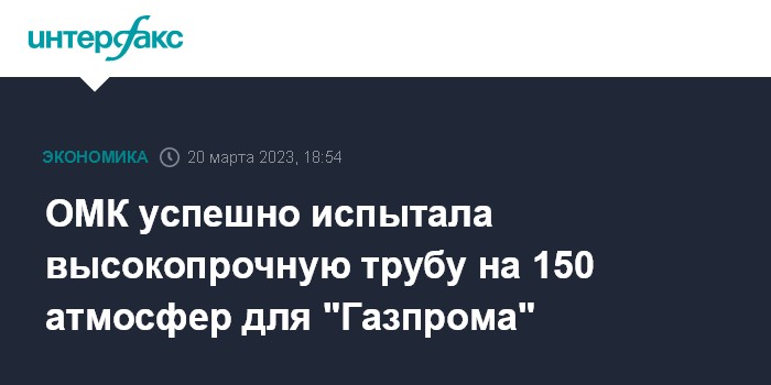 Москва. 20 марта. INTERFAX.RU - "Объединенная металлургическая компания" (ОМК) и "Газпром" провели испытания высокопрочных труб большого диаметра для магистральных газопроводов высокого давления, сообщила ОМК.