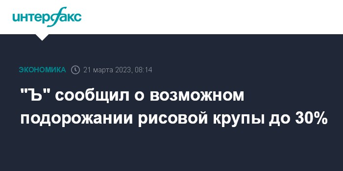 Москва. 21 марта. INTERFAX.RU - Рисовая крупа в РФ может подорожать от 8% до 30% из-за снижения качества риса-сырца в связи с неблагоприятными погодными условиями в Краснодарском крае (основной производитель риса в РФ). Большой процент выбраковки риса ведет к увеличению стоимости крупы, сообщает "Коммерсантъ" со ссылкой на свои источники.