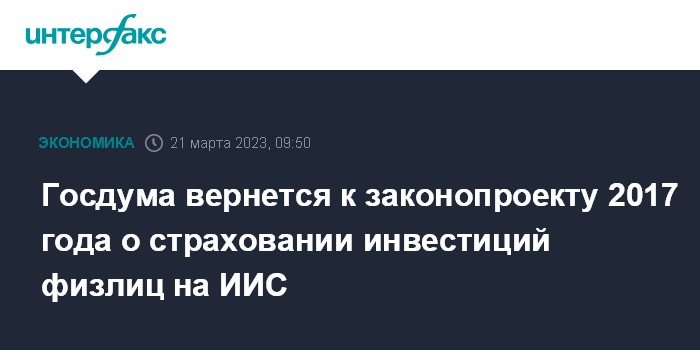 Москва. 21 марта. INTERFAX.RU - Депутаты Госдумы решили вернуться к проекту федерального закона "О страховании инвестиций физических лиц на индивидуальных инвестиционных счетах" (№76910-7), принятому в первом чтении еще в июне 2017 года.
