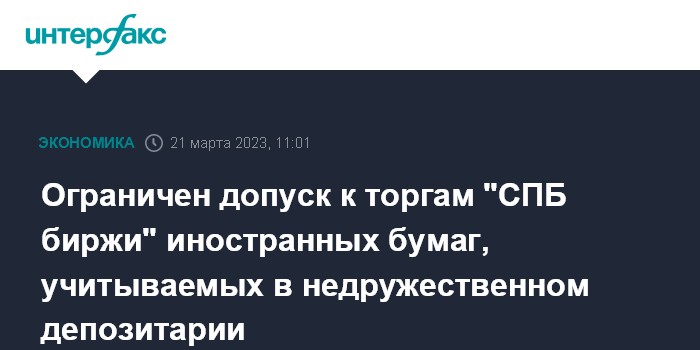 Москва. 21 марта. INTERFAX.RU - Допуск к организованным торгам "СПБ биржи" новых иностранных ценных бумаг, разрешенных для неквалифицированных инвесторов, если они учитываются в недружественном депозитарии, приостанавливается с 21 марта, сообщается в информации Банка России.