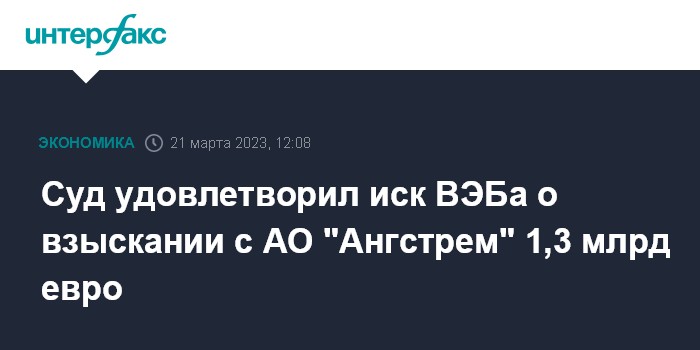 Москва. 21 марта. INTERFAX.RU - Арбитражный суд Москвы во вторник удовлетворил иск госкорпорации "ВЭБ.РФ" о взыскании с производителя микропроцессоров и RFID-систем АО "Ангстрем" (Москва) 1,3 млрд евро.