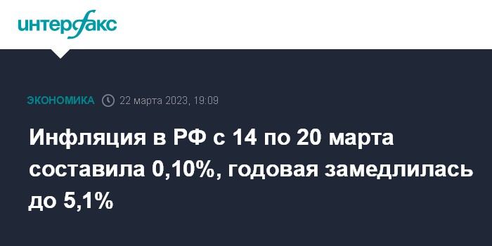 Инфляция в РФ с 14 по 20 марта составила 0,10%, годовая замедлилась до 5,1%
