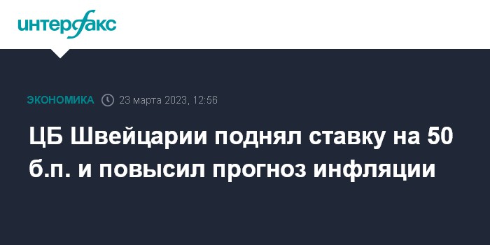 Москва. 23 марта. INTERFAX.RU - Швейцарский национальный банк (SNB, центробанк страны) в четверг повысил базовую ставку на 50 базисных пунктов - до 1,5% годовых, говорится в сообщении регулятора.
