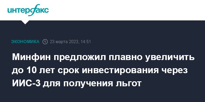 Москва. 23 марта. INTERFAX.RU - Минфин понимает, что в сложившейся ситуации для стимулирования долгосрочных инвестиций через индивидуальные инвестиционные счета третьего типа (ИИС-3) переход надо осуществлять плавно, начиная с необходимого для получения налоговых льгот срока пять лет в 2024 году, с ежегодным увеличением на год, до 10-летнего срока.