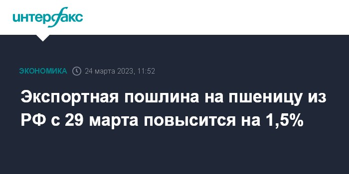 Москва. 24 марта. INTERFAX.RU - Экспортная пошлина на пшеницу из РФ с 29 марта повысится на 1,5%, до 5 409,6 рубля с 5 327,9 рубля, сообщает Минсельхоз.