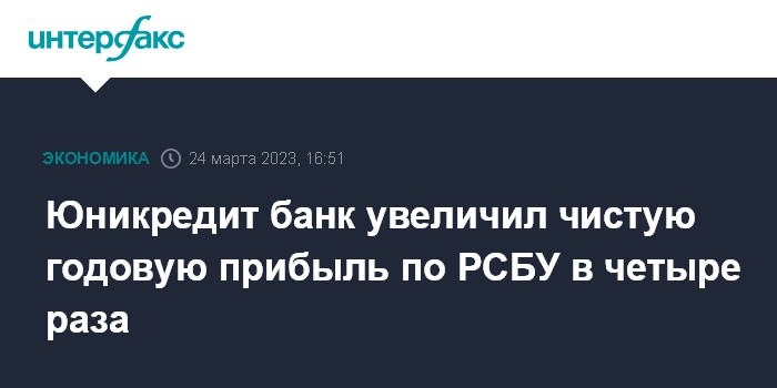 Москва. 24 марта. INTERFAX.RU - Юникредит банк, дочерний банк итальянской группы UniCredit, в 2022 году увеличил чистую прибыль по РСБУ в 4 раза, до 56,5 млрд рублей, свидетельствует отчетность кредитной организации.