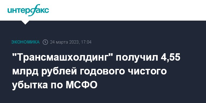 Москва. 24 марта. INTERFAX.RU - Консолидированный чистый убыток "Трансмашхолдинга" (ТМХ) по МСФО составил в 2022 году 4,55 млрд рублей против чистой прибыли в размере 8,6 млрд рублей годом ранее, следует из отчета группы.