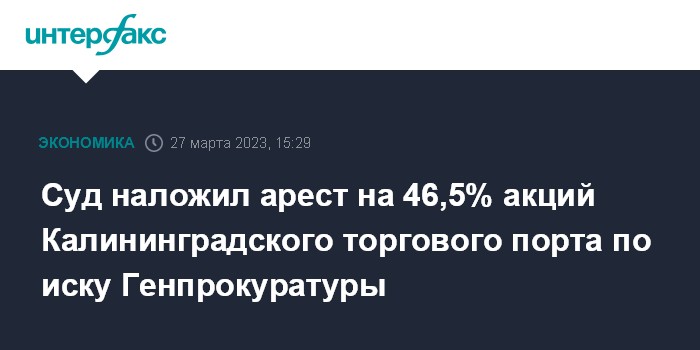 Москва. 27 марта. INTERFAX.RU - Арбитражный суд Калининградской области принял обеспечительные меры и наложил арест на 46,5% акций АО "Калининградский морской торговый порт" (КМТП, один из крупнейших стивидоров в порту Калининграда) по иску Генеральной прокуратуры.