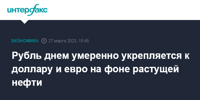 Как отмечают эксперты "Интерфакс-ЦЭА", рубль умеренно укрепляется к доллару и евро в ходе дневных торгов, поддержку его котировкам оказывают растущая нефть и спрос на рублевую ликвидность со стороны компаний-экспортеров перед единым днем налоговых платежей. Во вторник, 28 марта, в бюджет должны будут быть перечислены акцизы, НДС, НДПИ, налог на прибыль и страхование.