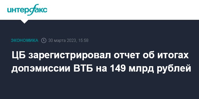 Москва. 30 марта. INTERFAX.RU - Банк России зарегистрировал отчет об итогах допэмиссии ВТБ общим объемом 149 млрд рублей, говорится в материалах на сайте регулятора.