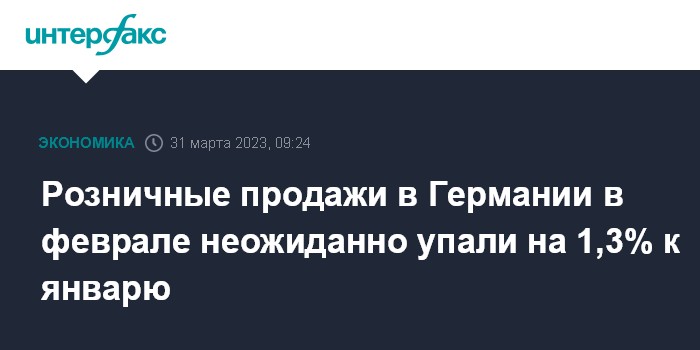 Москва. 31 марта. INTERFAX.RU - Розничные продажи в Германии в феврале сократились на 1,3% относительно предыдущего месяца, свидетельствуют данные Федерального статистического агентства страны (Destatis).