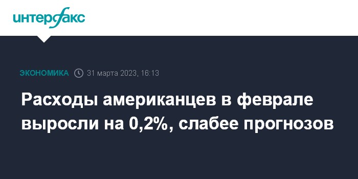 Москва. 31 марта. INTERFAX.RU - В феврале 2023 года расходы населения США выросли на 0,2% к январю, сообщило Министерство торговли страны. страны.