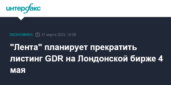 Москва. 31 марта. INTERFAX.RU - Ритейлер "Лента" подал британскому регулятору заявку о прекращении листинга своих глобальных депозитарных расписок (GDR) с Лондонской фондовой биржи (LSE) 4 мая, сообщила пресс-служба компании.