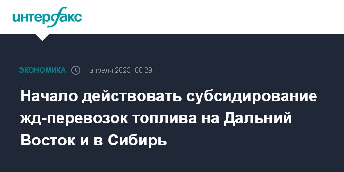 Москва. 1 апреля. INTERFAX.RU - Субсидирование из бюджета РФ жд-перевозок нефтепродуктов в Дальневосточный федеральный округ (ДФО) и ряд регионов Сибирского федерального округа (СФО) началось с 1 апреля 2023 года, речь идет о перевозках бензина, дизтоплива и авиакеросина российскими юридическими лицами.