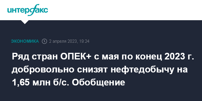 Ряд стран ОПЕК+ с мая по конец 2023 г. добровольно снизят нефтедобычу на 1,65 млн б/с. Обобщение