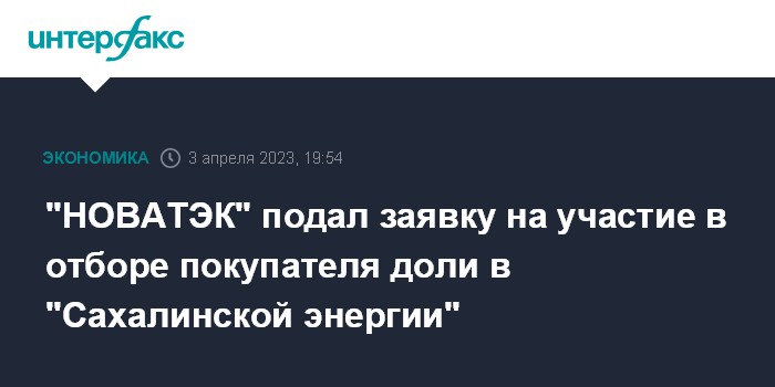 Москва. 3 апреля. INTERFAX.RU - "НОВАТЭК" подал заявку на участие в отборе покупателя доли в операторе проекта "Сахалин-2" ООО "Сахалинская энергия".
