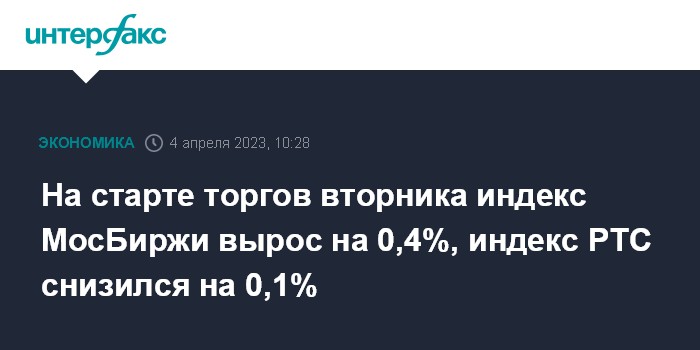 На старте торгов вторника индекс МосБиржи вырос на 0,4%, индекс РТС снизился на 0,1%