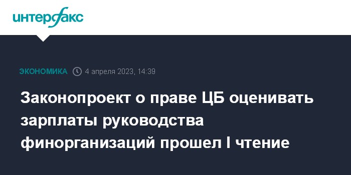 Москва. 4 апреля. INTERFAX.RU - Госдума приняла в I чтении законопроект, который даст Банку России полномочия по оценке уровня зарплат топ-менеджеров некредитных финансовых организаций на предмет их соответствия "характеру и масштабу" проводимых операций вплоть до сокращения или отмены компенсационных и стимулирующих выплат.