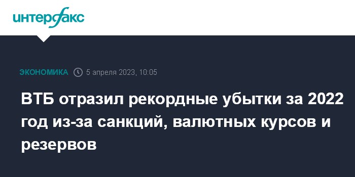 Москва. 5 апреля. INTERFAX.RU - ВТБ спустя год после попадания под западные санкции опубликовал финансовую отчетность: наложенные ограничения, блокировка зарубежных активов, волатильность курса и резкий рост ключевой ставки привели к рекордным убыткам за 2022 год в размере 756,8 млрд рублей по российским стандартам бухучета и 613 млрд рублей - по международным.