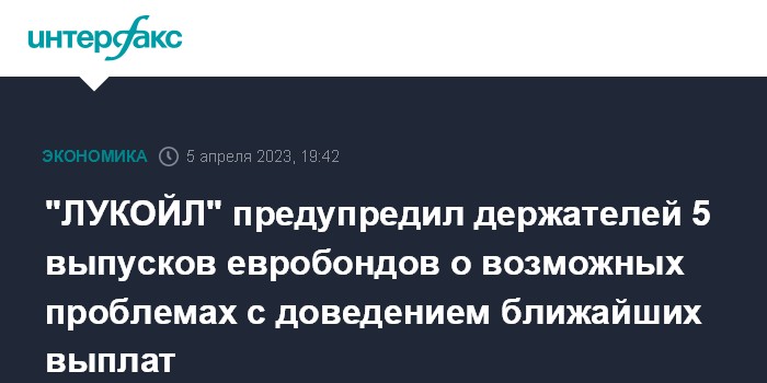 Москва. 5 апреля. INTERFAX.RU - "ЛУКОЙЛ" предупредил держателей пяти выпусков еврооблигаций о возможных проблемах с доведением ближайших выплат по ним из-за сложностей с осуществлением платежей через иностранную платежную инфраструктуру.