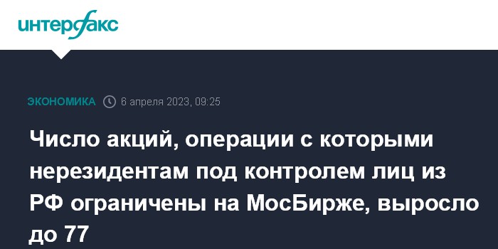 Москва. 6 апреля. INTERFAX.RU - Количество акций предприятий и организаций, на которые распространяются ограничения для совершения операций на Московской бирже клиентами-нерезидентами, находящимися под контролем российских юридических или физических лиц, увеличилось до 77.