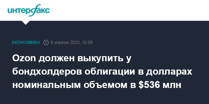 Москва. 6 апреля. INTERFAX.RU - Ozon, в рамках реструктуризации выпуска бондов на $750 млн со сроком погашения в 2026 году, должен выкупить у держателей облигации в долларах номинальным объемом в $536 млн, говорится в пресс-релизе компании.