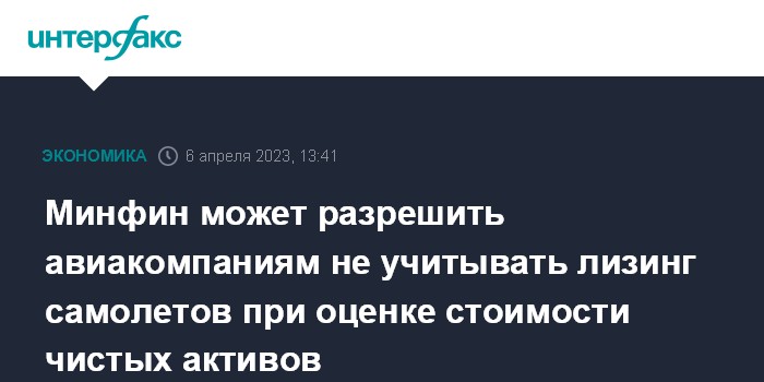 Москва. 6 апреля. INTERFAX.RU - Минфин РФ подготовил проект приказа, который позволит авиакомпаниям в 2023-2024 гг. не учитывать лизинг воздушных судов при оценке стоимости чистых активов. Документ опубликован на портале regulation.gov.ru.