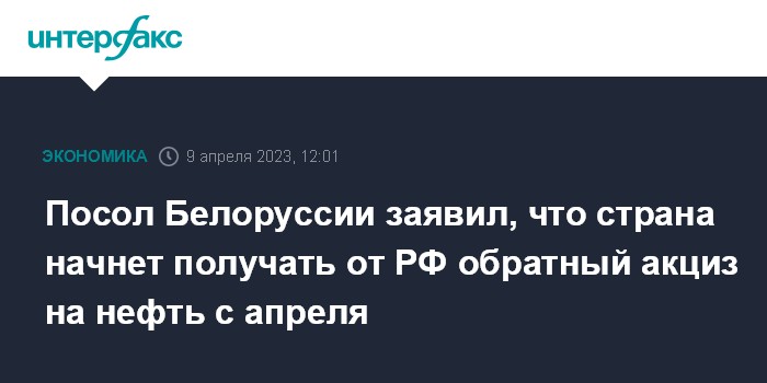 Москва. 9 апреля. INTERFAX.RU - Белоруссия в соответствии с договоренностями начнет получать от России обратный акциз на нефть с апреля текущего года, сообщил белорусский посол в Москве Дмитрий Крутой.