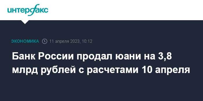 Москва. 11 апреля. INTERFAX.RU - Банк России продал валюту расчетами 10 апреля на 3,8 млрд рублей, следует из данных на сайте регулятора.