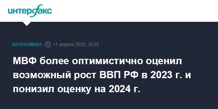 Москва. 11 апреля. INTERFAX.RU - Международный валютный фонд (МВФ) продолжил повышать свою оценку динамики российской экономики в 2023 году - ожидает роста на 0,7% (в январе прогноз был на уровне 0,3%, в октябре ожидалось падение на 2,3%). Такая оценка приводится в апрельском обзоре мировой экономики (World Economic Outlook: A Rocky Recovery), опубликованном фондом во вторник.