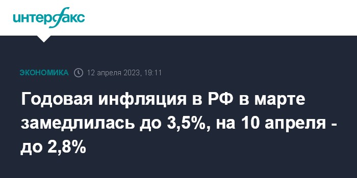 Годовая инфляция, по данным Росстата, в марте 2023 года замедлилась до 3,51% (аналитики ожидали замедления до 3,3-3,4%) с 10,99% на конец февраля, 11,77% на конец января и 11,94% на конец декабря. Годовая инфляция в марте достигла минимума с июля 2020 года.